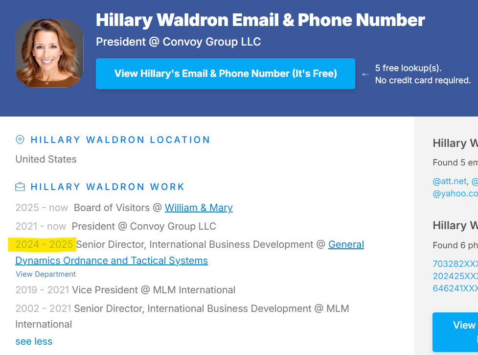 Η Χίλαρι ήταν ανώτερη διευθύντρια της General Dynamics Ordnance and Tactical Systems.