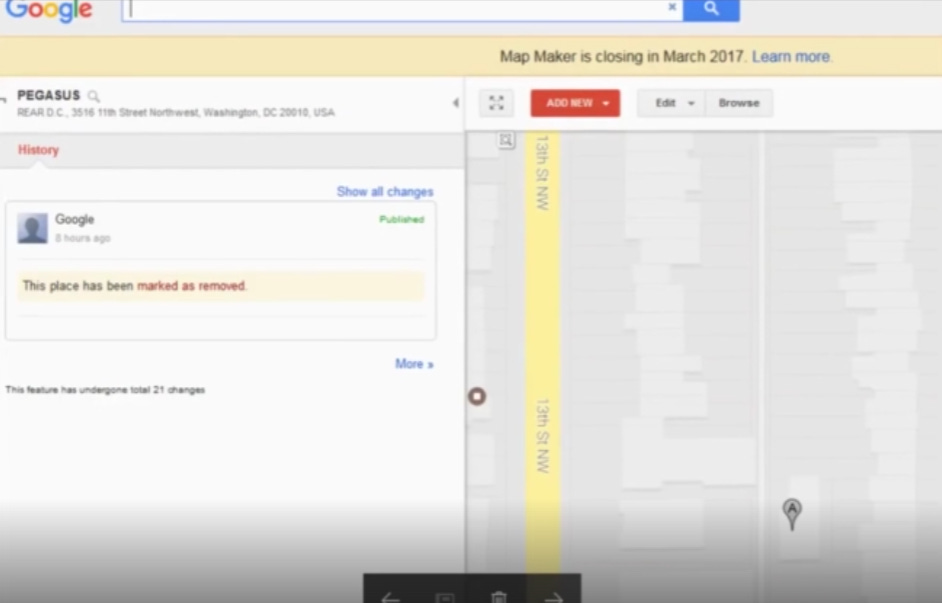 Όταν κυκλοφόρησε η είδηση «pizzagate», η οποία συνέδεσε τον Τζέιμς με αυτή τη μη δημόσια επιχείρηση, ο Τζέιμς, ή κάποιος που ενεργούσε για λογαριασμό του Τζέιμς, αφαίρεσε γρήγορα το Pegasus από την Google.