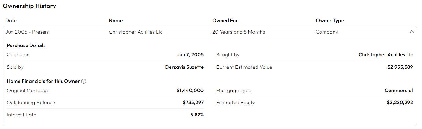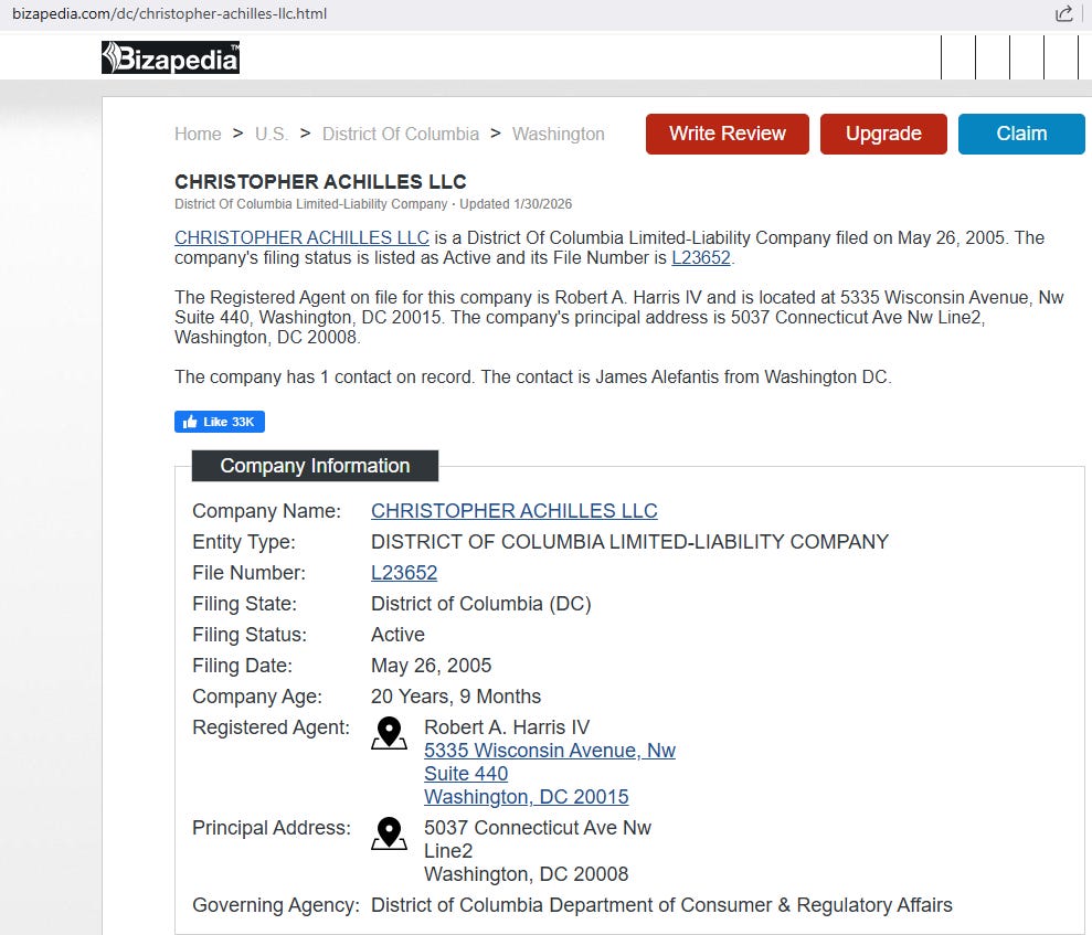 Τώρα ήρθε η ώρα να συζητήσουμε την επιχείρηση που ανήκει στην CHRISTOPHER ACHILLES LLC, στην οποία είπα ότι θα επανέλθω. Αυτή είναι η επιχείρηση που συνδέεται με το Parker House Condos. Είναι η εταιρεία που βρίσκεται στη λεωφόρο Κονέκτικατ 5037, και αυτή η οντότητα είναι το κλειδί για το όλο καταραμένο πράγμα....ΣΥΝΕΧΙΖΕΤΑΙ
