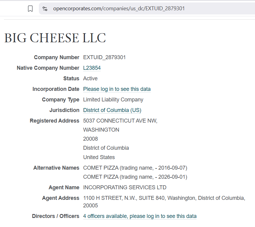 Ο εγγεγραμμένος αντιπρόσωπος στο Big Cheese είναι μια εταιρεία που ονομάζεται Incorporated Services, LTD. Η διεύθυνσή τους είναι 1100 H Street, Suite 840, Washington, DC. Αυτή η διεύθυνση μας φέρνει εδώ.
