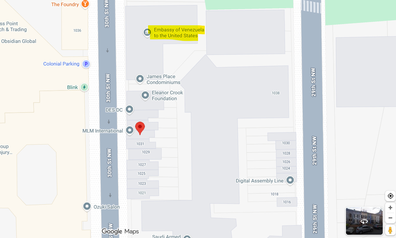 Το οποίο, με την πρώτη ματιά, φαίνεται να μην είναι τίποτα άλλο από ένα σπίτι, αλλά αν αλλάξουμε γωνίες στους Χάρτες Google και το δούμε από ψηλά, ανακαλύπτουμε ότι βρίσκεται σχεδόν δίπλα στην Πρεσβεία της Βενεζουέλας στις Ηνωμένες Πολιτείες.