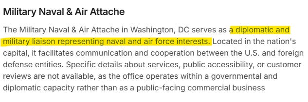 Σύμφωνα με το διαδίκτυο, ο Στρατιωτικός, Ναυτικός και Αεροπορικός Ακόλουθος λειτουργεί ως διπλωματικός και στρατιωτικός σύνδεσμος που εκπροσωπεί τα συμφέροντα του ναυτικού και της αεροπορίας. Ένα έγγραφο του Ναυτικού που εντόπισα έλεγε ότι αυτά είναι στρατηγικά τοποθετημένα σε εξωτικές και μοναδικές τοποθεσίες.
