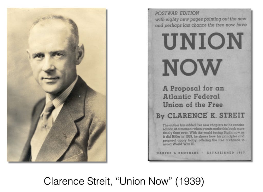 Το 1939 ο Κλάρενς Στρέιτ πρότεινε την ενοποίηση της Βόρειας Αμερικής και της Ευρώπης σε μια Ατλαντική Ένωση, η οποία θα χρησίμευε ως η πρώτη φάση προς την ενσωμάτωση του υπόλοιπου κόσμου στην παγκόσμια ένωση.