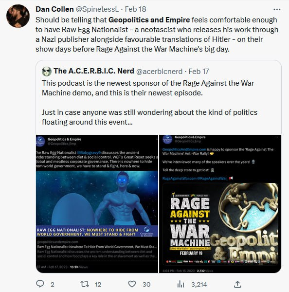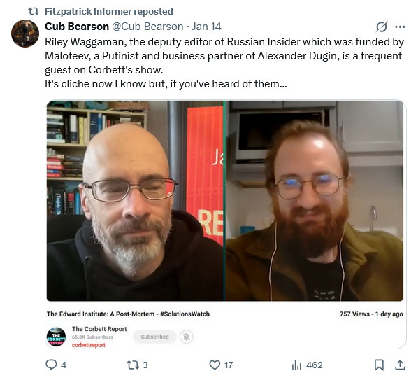 Είχα πάρει συνέντευξη από τον Jeff Nyquist επειδή πίστευα ότι υπήρχε κάτι στη θεωρία του Golitsyn. Δεδομένης της σχέσης του με αυτό το δίκτυο, αρχίζω όλο και περισσότερο να πιστεύω ότι η θεωρία του Γκολίτσιν ήταν μια PSYOP του Πενταγώνου. Μου φάνηκε περίεργο το γεγονός ότι όταν πήρα συνέντευξη από τον Nyquist ακριβώς πριν από την εισβολή της Ρωσίας στην Ουκρανία το 2022, ήξερε ότι η εισβολή επρόκειτο να συμβεί, είπε ότι θα εισέβαλαν μια ή δύο εβδομάδες αργότερα και το έκαναν. https://x.com/JRNyquist
