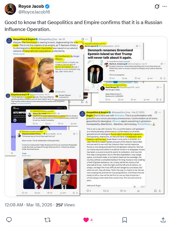 Μερικά από τα σημάδια που έχω παρατηρήσει περιλαμβάνουν μια ραγδαία φαινομενικά ανόργανη αύξηση του αριθμού των οπαδών σε διαφορετικές κοινωνικές πλατφόρμες, πληρωμένα ταξίδια στην Ανατολή και μια γενική αφηγηματική προσκόλληση στο ότι η Δύση είναι κακή, η Ανατολή είναι καλή και αποφεύγει τα θέματα της παγκοσμιοποίησης και της ολοκληρωτικής τεχνοκρατίας ή πλαισιώνει την τεχνοκρατία ως δημόσιο αγαθό, με έναν περίεργο κρατικιστικό τρόπο ή σύνδρομο της Στοκχόλμης. Πιστεύω ότι οι κυβερνήσεις τόσο της Ανατολής όσο και της Δύσης είναι εξίσου απαίσιες και εφαρμόζουν τον ίδιο παγκοσμιοποιητικό, τεχνοκρατικό, ολοκληρωτισμό.