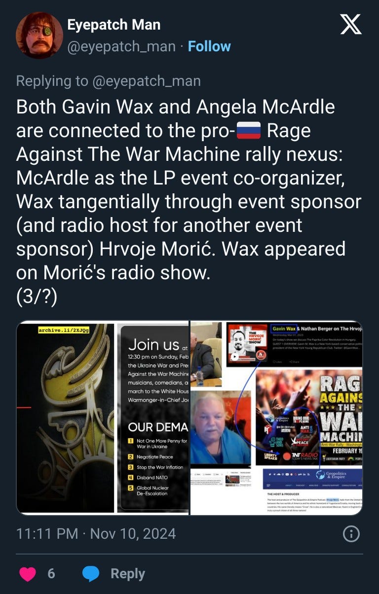 Προσπάθησαν επίσης να προσπαθήσουν να με παρουσιάσουν ως Ρώσο πράκτορα επειδή είχα πάρει συνέντευξη από τον Matthew Ehret καθώς και από μερικούς από τους LaRoucheites. Παρεμπιπτόντως, πιστεύω ότι το κίνημα LaRouche συνδέεται με το κίνημα πολυπολικότητας BRICS. Οι LaRouchites έχουν κάποια ενδιαφέρουσα ανάλυση, αλλά τελικά αποκλίνω από αυτούς επειδή προωθούν την παγκοσμιοποιημένη υπερεθνική πολυπολικότητα.