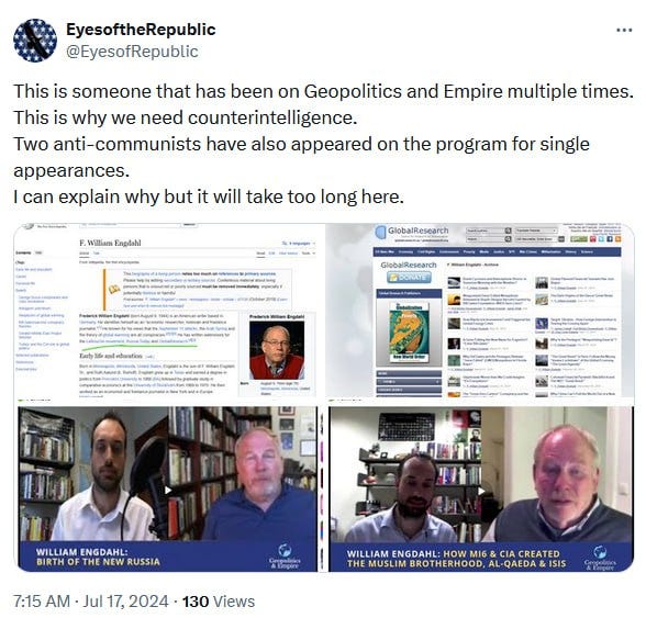 Περνούσαν από τις συνεντεύξεις μου στο Geopolitics & Empire και στο TNT Radio επιλέγοντας στιγμιότυπα από καλεσμένους που δεν τους άρεσαν, δηλαδή πολυπολικούς, όπως ο Matthew Ehret. Τι σύμπτωση!