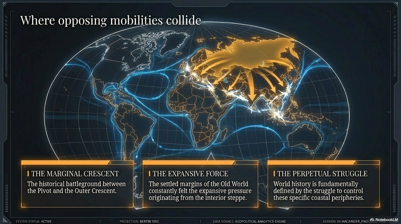 Το πιο αδύναμο σημείο στη ζώνη του κόσμου Η γη που περικλείεται από αυτές τις πέντε θάλασσες - την Εγγύτερη Ανατολή (αυτό που ονομάζουμε Μέση Ανατολή σήμερα) - είναι η άρθρωση μεταξύ των παγκόσμιων ζωνών. Είναι εκεί όπου η Heartland συναντά την ακτή, όπου η χερσαία δύναμη συναντά τη θαλάσσια δύναμη. Ο Mackinder την σημείωσε ως την πιο επίμονα ασταθή περιοχή στον κόσμο - πολύ ξηρή για μεγάλους εγκατεστημένους πληθυσμούς, πολύ κεντρική για να μείνει μόνη της. Κάθε αυτοκρατορία το έχει ποθήσει. Κανείς δεν το κράτησε πολύ. «Εδώ είναι το πιο αδύναμο σημείο στη ζώνη των πρώιμων πολιτισμών, γιατί ο ισθμός του Σουέζ χώριζε τη θαλάσσια δύναμη σε Ανατολική και Δυτική, και τις άνυδρες ερημιές της Περσίας... έδωσε συνεχή ευκαιρία στη νομαδική δύναμη να χτυπήσει την άκρη του ωκεανού». — Mackinder, 1904 04 —