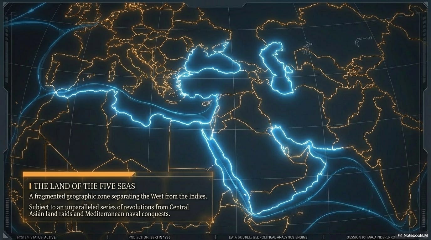 Αυτός είναι ο φακός μέσα από τον οποίο ο Mackinder είδε όλη τη σύγχρονη ιστορία: η Heartland πιέζει προς τα έξω προς τη θάλασσα και οι θαλάσσιες δυνάμεις πιέζουν προς τα μέσα μέσα από τα παράκτια περιθώρια. Η Χώρα των Πέντε Θαλασσών είναι όπου αυτές οι δύο δυνάμεις συγκρούονταν πάντα. Η Ρωσία πίεσε νότια προς λιμάνια θερμών υδάτων. Η Βρετανία πρόβαλε δύναμη μέσω της Αιγύπτου και της Ινδίας. Οι Οθωμανοί διέσχισαν και τους δύο κόσμους για αιώνες. Η λογική είναι μόνιμη, ακόμα κι αν αλλάξουν οι ηθοποιοί. Ο έλεγχος του σταυροδρόμι σημαίνει φορολόγηση κάθε καραβάνι, κάθε δεξαμενόπλοιο, κάθε στρατό που περνά από εκεί. 05 —