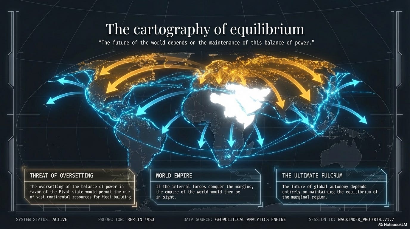 Μια Φόρμουλα για Παγκόσμια Δύναμη Τον Ιανουάριο του 1904, ο Halford Mackinder στάθηκε ενώπιον της Βασιλικής Γεωγραφικής Εταιρείας στο Λονδίνο για να προσφέρει μια ριζοσπαστική ιδέα: η γεωγραφία είναι η μηχανή της ιστορίας, όχι απλώς το σκηνικό της. Πρότεινε ότι ο κόσμος είχε μια μόνιμη δομή - έναν άξονα, μια ημισέληνο και έναν εξωτερικό δακτύλιο - και ότι όποιο κράτος έλεγχε τον άξονα θα κυριαρχούσε τελικά στον κόσμο. «Είναι ίσως μια από τις πιο εντυπωσιακές συμπτώσεις της ιστορίας ότι η θαλάσσια και η χερσαία επέκταση της Ευρώπης θα πρέπει, κατά μία έννοια, να συνεχίσουν την αρχαία αντίθεση μεταξύ Ρωμαϊκών και Ελληνικών». — Mackinder, 1904 01 —
