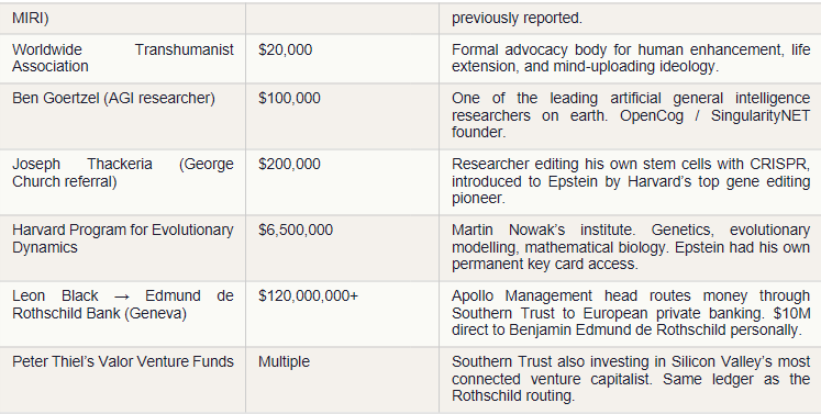 Η σύνθετη εικόνα είναι μια επιχείρηση χρηματοπιστωτικής διαμεσολάβησης εξαιρετικής κλίμακας. Η Southern Trust Company του Epstein - το κέλυφος ανάλυσης DNA του - διοχέτευε 167 εκατομμύρια δολάρια μεταξύ της Apollo Management του Leon Black (ένα από τα μεγαλύτερα ιδιωτικά επενδυτικά κεφάλαια της Wall Street), της ιδιωτικής τραπεζικής αυτοκρατορίας Edmund de Rothschild στη Γενεύη και των Valor Venture Funds του Peter Thiel. Το εξώφυλλο για όλα αυτά ήταν η γενετική.