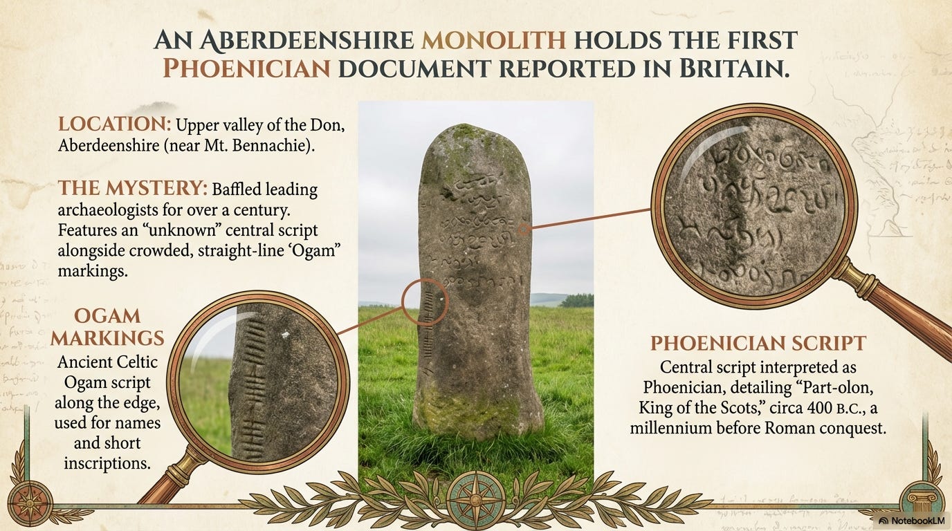 Η Φοινικική Καταγωγή των Βρετανών, Σκωτσέζων και Αγγλοσαξόνων (1924) του L. A. Waddell προωθεί έναν εκπληκτικό ισχυρισμό: η πρώιμη Βρετανία σχημάτισε μια αποικιακή επέκταση ενός θαλάσσιου Άριου φοινικικού κόσμου και το βιβλίο ανακτά αυτή τη σύνδεση μέσω επιγραφών, θρύλων νομισμάτων, μνημείων και κληρονομικών ονομάτων που ο Waddell ερμηνεύει ως τεκμηριωμένες επιβιώσεις ενός προ-ρωμαϊκού εγγράμματου πολιτισμού.