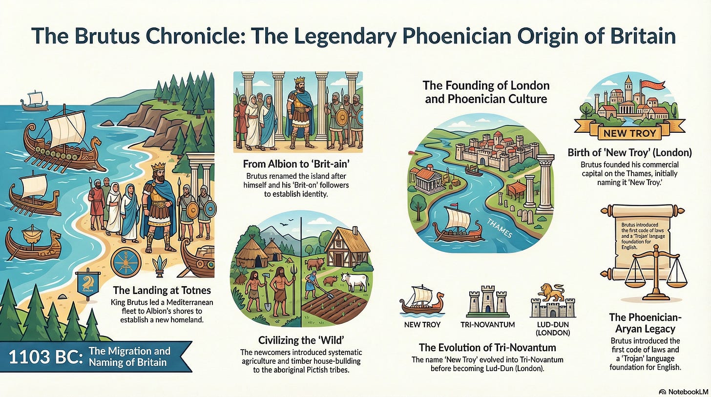 Μόλις ο Waddell αναγνωρίζει την ιστορική υπόσταση των χρονικών, τα χρησιμοποιεί για να οργανώσει ένα μεγάλο μεταναστευτικό κύμα υπό τον «Βασιλιά Βρούτο-τον-Τρώα», το οποίο χρονολογεί περίπου στο 1103 π.Χ. Πλαισιώνει τον Βρούτο ως ηγέτη της Μεσογείου του οποίου ο στόλος διασχίζει τις Ηράκλειες Στήλες προς τους πόρους κασσίτερου και χρυσού της Αλβιόνας και τοποθετεί τον Βρούτο ως τον οργανωτή που επιβάλλει το νόμο, την πολιτική τάξη και τα ονόματα που διατηρούν τη μνήμη της γεωγραφίας της πατρίδας. Ένα βασικό επεισόδιο επικεντρώνεται στο Λονδίνο. Ο Waddell αναφέρει ότι ο Βρούτος ίδρυσε μια πόλη στον Τάμεση που ονομάζεται «Νέα Τροία» και τη συνδέει με το μεταγενέστερο όνομα Tri-Novantum και στη συνέχεια με το Kaer-Lud και το Λονδίνο μέσω μιας αλυσίδας διαδοχικών μετονομασιών. Ενισχύει την αληθοφάνεια της ονομασίας της «Νέας Τροίας» επικαλούμενος τις συνήθειες ονοματοδοσίας των Τρώων στην Ήπειρο, όπου ο Έλενος, γιος του Πριάμου, κυβερνά και καθιερώνει αναφορές που σχετίζονται με την Τροία που περιγράφουν ο Βιργίλιος και ο Οβίδιος στην κλασική λογοτεχνία. Ο Waddell αντιμετωπίζει αυτές τις κλασικές παραπομπές ως πολιτισμικό πλαίσιο για το γιατί ο Βρούτος θα επέβαλε ξανά ένα όνομα Τροίας σε βρετανικό έδαφος.