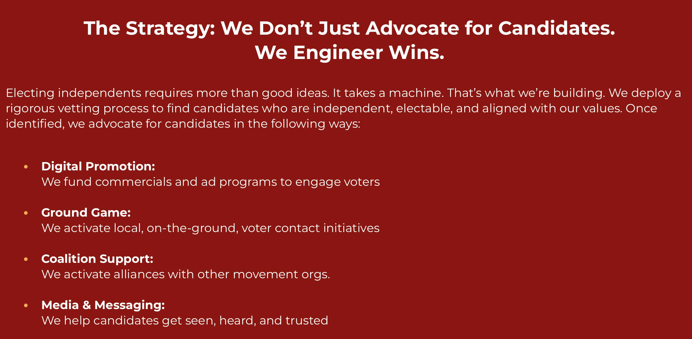 Το PAC πλαισιώνει ρητά τον στόχο του ως τη διατήρηση της «ισορροπίας δυνάμεων» στο Κογκρέσο - όχι την εκπροσώπηση μιας εκλογικής περιφέρειας, την προώθηση μιας πλατφόρμας που έχει τις ρίζες της στη συναίνεση των κυβερνωμένων, αλλά τη διατήρηση της ισορροπίας - που σημαίνει την τοποθέτηση ενός μικρού πιστοποιημένου μπλοκ για να ανατρέψει τα αποτελέσματα σε ένα διχασμένο νομοθετικό σώμα. Αυτό δεν είναι αναπαράσταση. Είναι αρχιτεκτονική μόχλευσης.