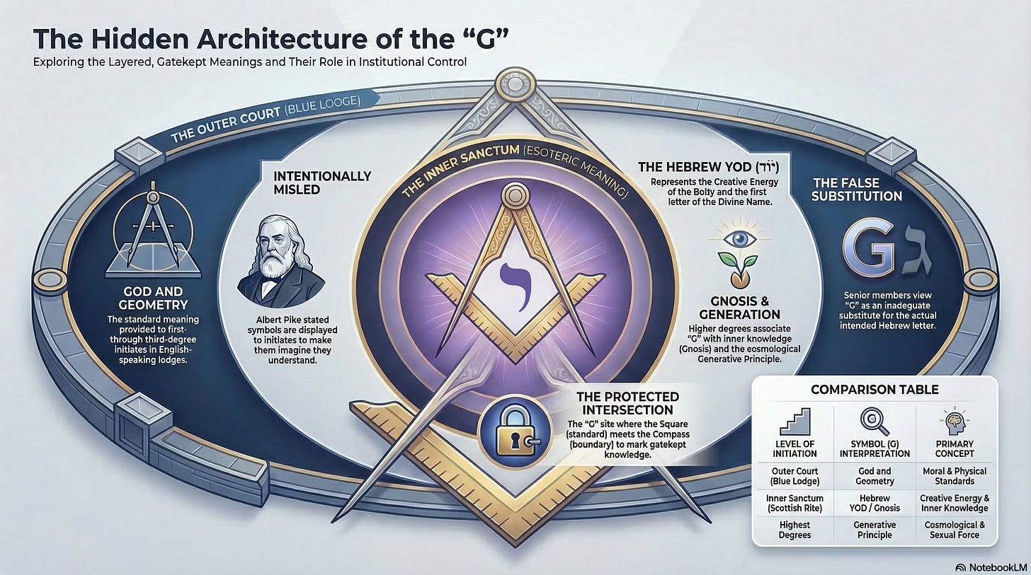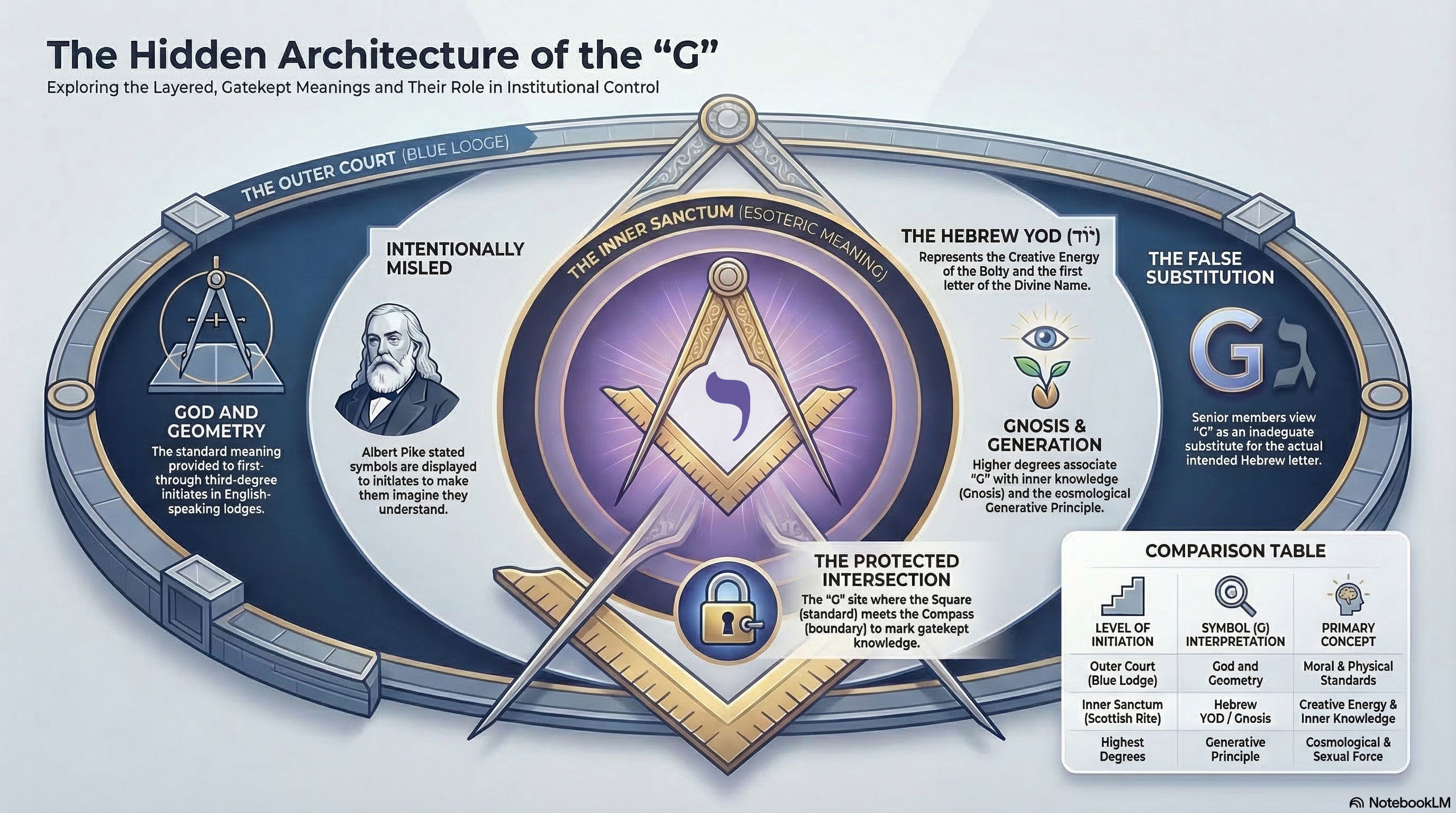 Τα ανώτερα μέλη σε υψηλότερα επίπεδα βαθμού συνδέουν το G με τη Γνώση - εσωτερική γνώση διαθέσιμη σε όσους επιδιώκουν την εσωτερική κατανόηση μέσω εξουσιοδοτημένης προόδου - και με τη Γενεσιουργό Αρχή, με την κοσμολογική της έννοια και, σε περαιτέρω βαθμούς, με τη ρητά σεξουαλική της έννοια.7 Οι έννοιες της Μπλε Στοάς (Θεός, Γεωμετρία) δεν είναι ψευδείς. Είναι το εξωτερικό ανάγνωσμα της αυλής, που προσφέρεται σε μυημένους που, σύμφωνα με τα λόγια του ίδιου του Pike, οι ηγέτες σκοπεύουν να φύγουν, φανταζόμενοι ότι καταλαβαίνουν το σύμβολο χωρίς να το καταλαβαίνουν πραγματικά.