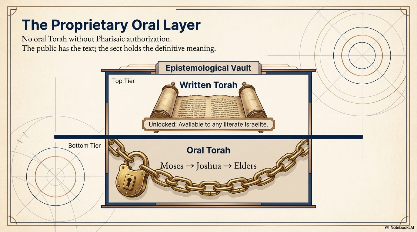 Οι Φαρισαίοι θεωρούσαν την προφορική Τορά ως ιδιόκτητο ερμηνευτικό τους όργανο. Η γραπτή Τορά - τα πέντε βιβλία του Μωυσή - ήταν δημόσια. Κάθε εγγράμματος Ισραηλίτης μπορούσε να το διαβάσει. Η προφορική Τορά ήταν διαφορετική. Οι Φαρισαίοι δάσκαλοι ισχυρίστηκαν ότι ο Μωυσής έλαβε δύο αποκαλύψεις στο Σινά: το γραπτό κείμενο και ένα συνοδευτικό σώμα ερμηνείας, που μεταδόθηκε από στόμα σε αυτί μέσω μιας αδιάσπαστης αλυσίδας εξουσιοδοτημένων δασκάλων και ανήκε αποκλειστικά σε εκείνους που ανήκαν στο δίκτυο των Φαρισαίων.