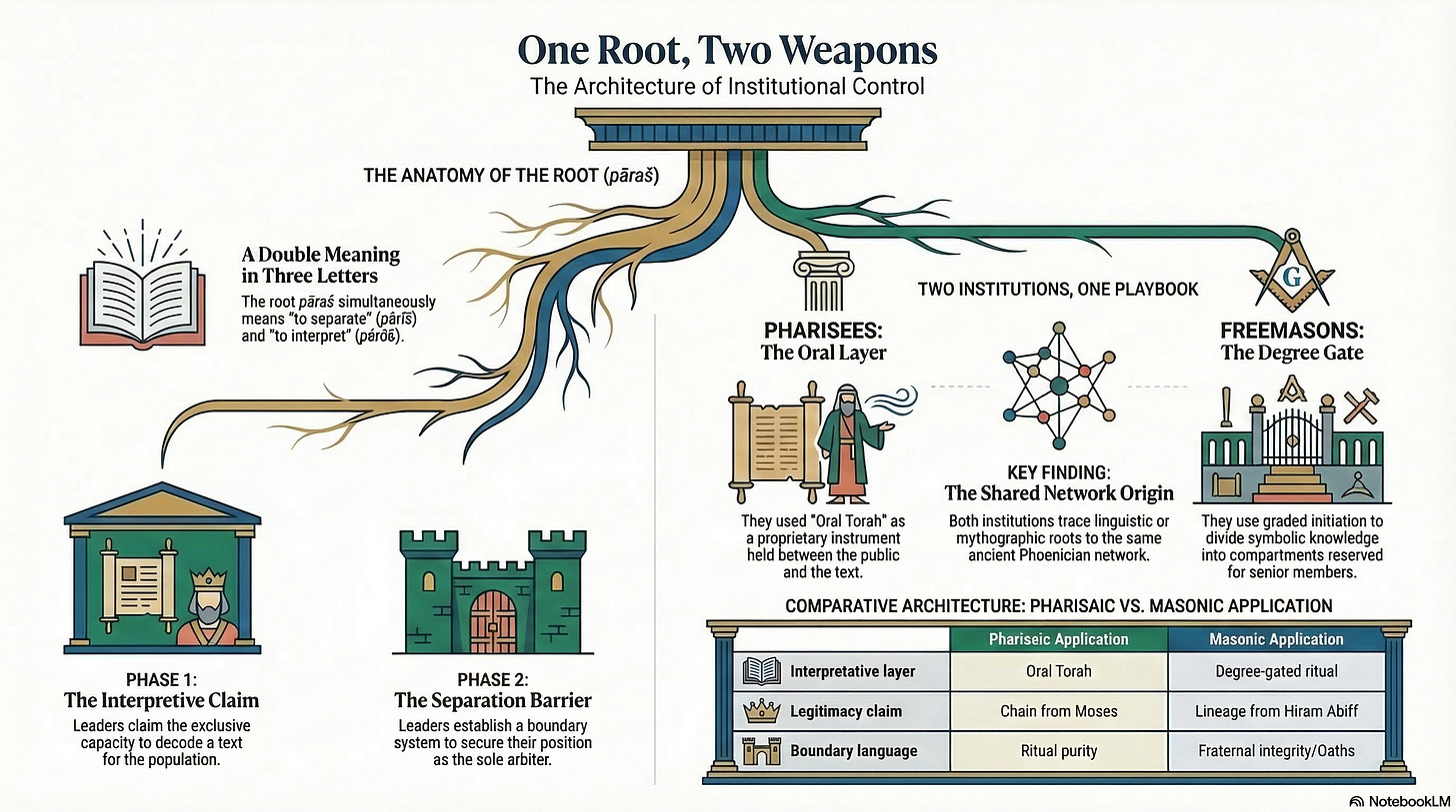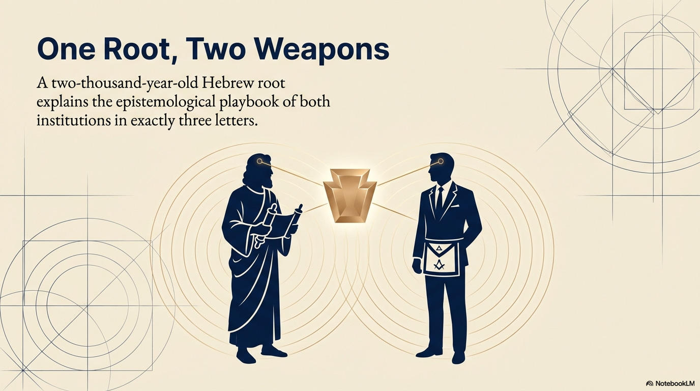 Η ακόλουθη ανάλυση του EpiWar εφαρμόζει το ξυράφι του Παρμενίδη™: αυτό που είναι, είναι. Αφήστε στην άκρη αυτά που ισχυρίζονται οι άνθρωποι για αυτούς τους θεσμούς. Αφήστε στην άκρη αυτό που ισχυρίζονται οι θεσμοί για τον εαυτό τους. Κοιτάξτε τι κάνει κάθε θεσμός — γλωσσικά, οντολογικά, επιστημολογικά — και παρατηρήστε τι υπάρχει στην πραγματικότητα. Αυτό που είναι κοινό και στις δύο περιπτώσεις είναι το ίδιο εβραϊκό ριζικό γράμμα, το οποίο κωδικοποιεί την ίδια αρχιτεκτονική ελέγχου δύο φάσεων και εκτελεί τον ίδιο βρόχο ορίων και ερμηνείας που έχει κάνει και τους δύο θεσμούς ανθεκτικούς σε αιώνες ελέγχου.