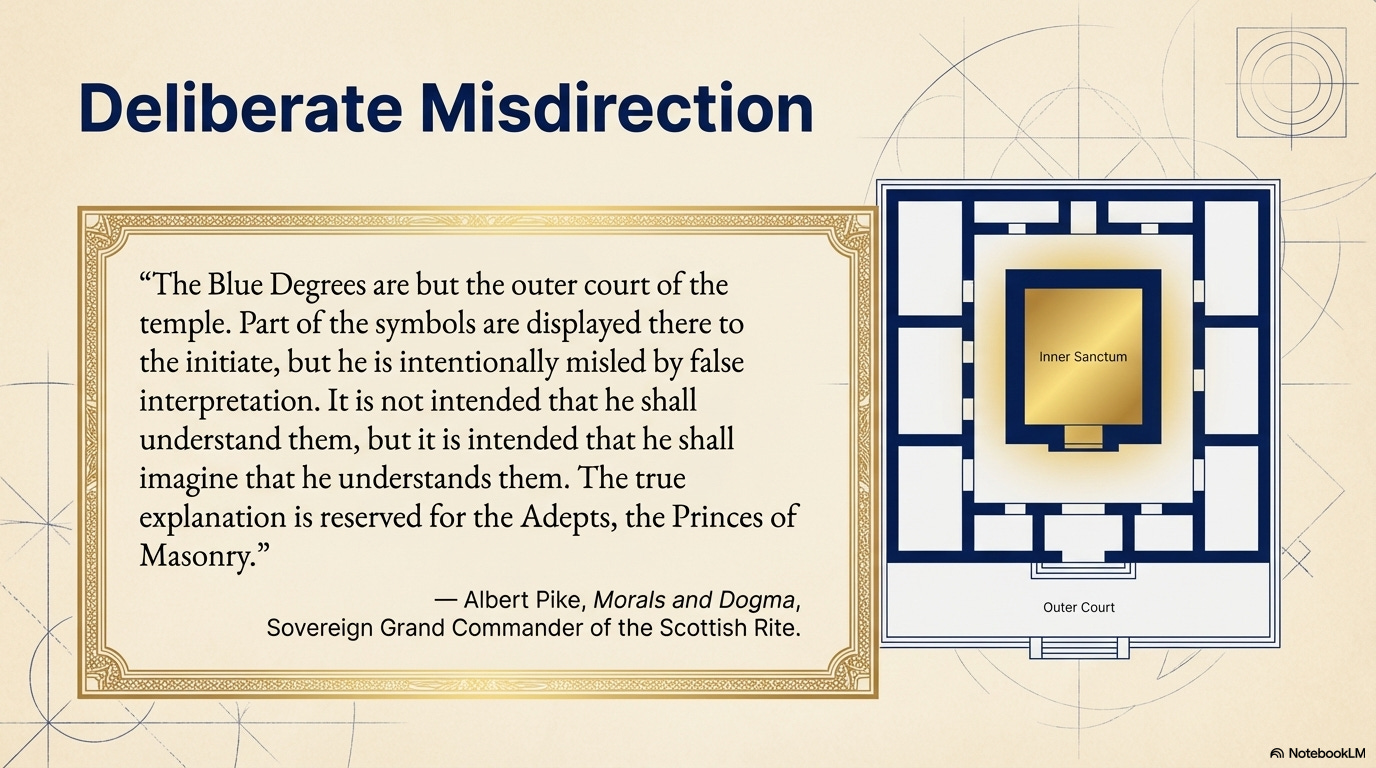 Ο Πάικ το έγραψε στον ίδιο τόμο που διένειμε σε κάθε Τέκτονα που ολοκλήρωνε τον 14ο βαθμό στη Νότια Δικαιοδοσία του Σκωτικού Τύπου — ένα βιβλίο που δεν έλαβαν οι Τέκτονες της Μπλε Στοάς.5 Περιέγραψε τη σκόπιμη παραπλάνηση των κατώτερων μυημένων σε κείμενο που έκανε προσβάσιμο μόνο σε ανώτερους μυημένους. Ο Pike έθεσε την περιγραφή της αρχιτεκτονικής σε κοινή θέα, σε κείμενο διαθέσιμο εκείνη την εποχή, μόνο στους αναγνώστες που βρίσκονταν ήδη εντός των ορίων.