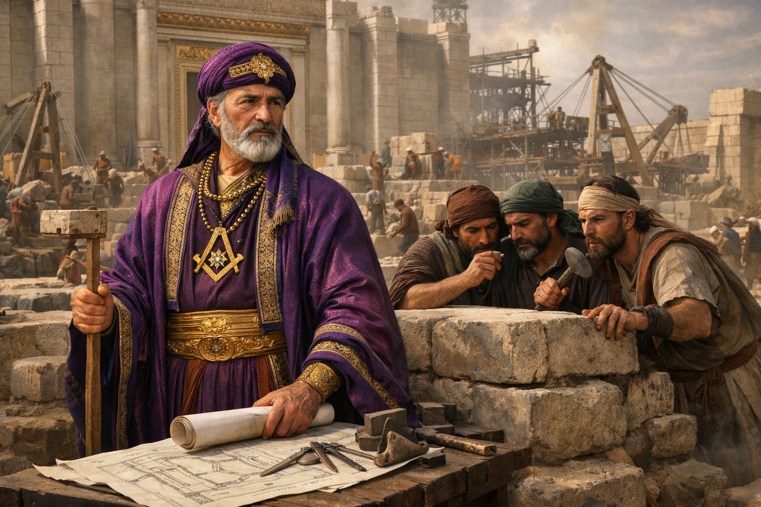 Η ιδρυτική θυσιαστική φιγούρα του μασονικού θρύλου είναι ο Hiram Abiff, ένας αρχιτεχνίτης του μπρούντζου και της αρχιτεκτονικής. Εμφανίζεται στο 1 Βασιλέων 7 και 2 Χρονικών 2 ως τεχνίτης που στάλθηκε από τον βασιλιά της Τύρου για να χτίσει τον Ναό του Σολομώντα - ένας Φοίνικας δάσκαλος από την πόλη που αγκυροβόλησε το κύριο μεσογειακό δίκτυο εμπορίου και πληροφοριών του δέκατου αιώνα π.Χ.8