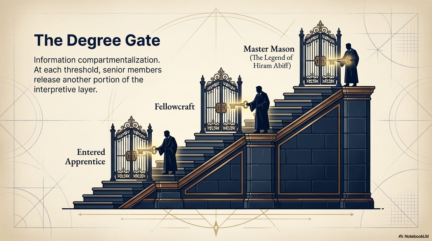Ο Τεκτονισμός ακολουθεί την ίδια επιστημολογική αρχιτεκτονική μέσω ενός διαφορετικού μηχανισμού: της διαβαθμισμένης μύησης.