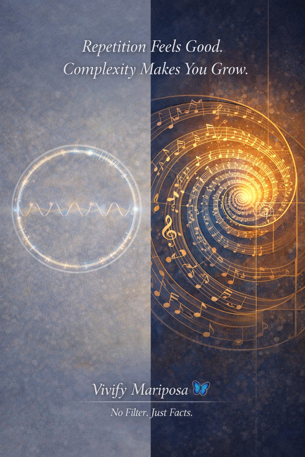 Συγκρίνετε αυτό με την επανάληψη της εμπορικής μουσικής: οι ίδιες τέσσερις συγχορδίες, το ίδιο άγκιστρο, η ίδια σταγόνα, που επαναλαμβάνεται χωρίς ανάπτυξη ή πολυπλοκότητα. Ο εγκέφαλός σας αναγνωρίζει γρήγορα το μοτίβο και σταματά να λειτουργεί. Αυτή είναι η διαφορά μεταξύ της μαθηματικής εμπλοκής και της χειραγώγησης της ντοπαμίνης.