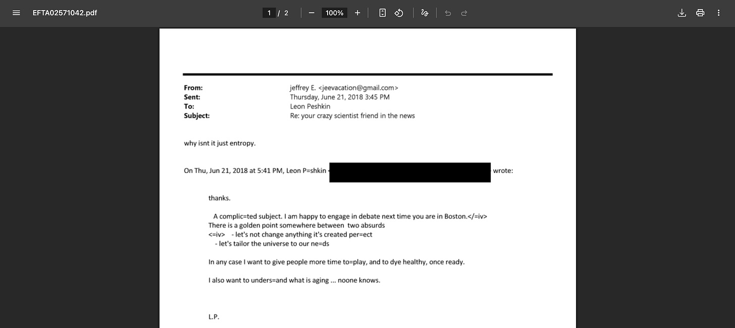 Σε μια άλλη ανταλλαγή, ο βιολόγος συστημάτων Leon Peschkin, επίσης στο Χάρβαρντ, γράφει στον Epstein για την έρευνα για τη γήρανση. Ο Peschkin περιγράφει τη δουλειά του ως αναζήτηση «ενός χρυσού σημείου κάπου ανάμεσα σε δύο παράλογα» και λέει ότι θέλει «να δώσει στους ανθρώπους περισσότερο χρόνο για να παίξουν, να πεθάνουν υγιείς μόλις είναι έτοιμοι».