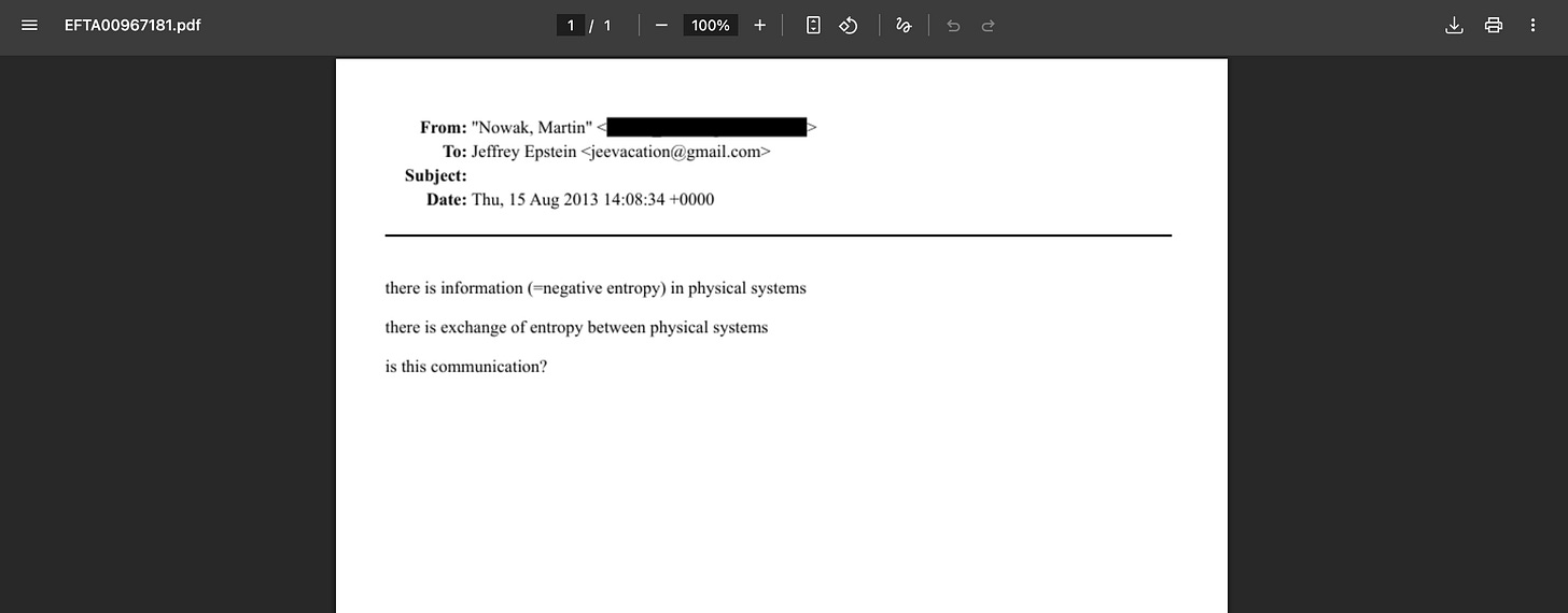 Ένας από τους σημαντικότερους εν ζωή μαθηματικούς βιολόγους ρωτά τον Jeffrey Epstein εάν η ανταλλαγή εντροπίας μεταξύ συστημάτων αποτελεί μια μορφή επικοινωνίας. Αν η ίδια η νεγεντροπία είναι ένας κώδικας, και αυτό δεν ήταν μια περιστασιακή ανταλλαγή. Ο Έπσταϊν έκανε μεγάλες δωρεές στο πρόγραμμα του Νόβακ στο Χάρβαρντ. Αυτή ήταν μια από τις πιο σταθερές πνευματικές-οικονομικές σχέσεις του.
